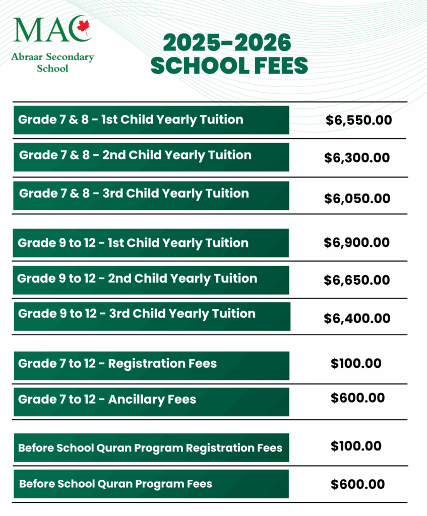 Parents Admissions Admissions 2025-2026 Registration Link (MACSIS) to register your child for Abraar Secondary School, please use this link. School Fees 2025-2025