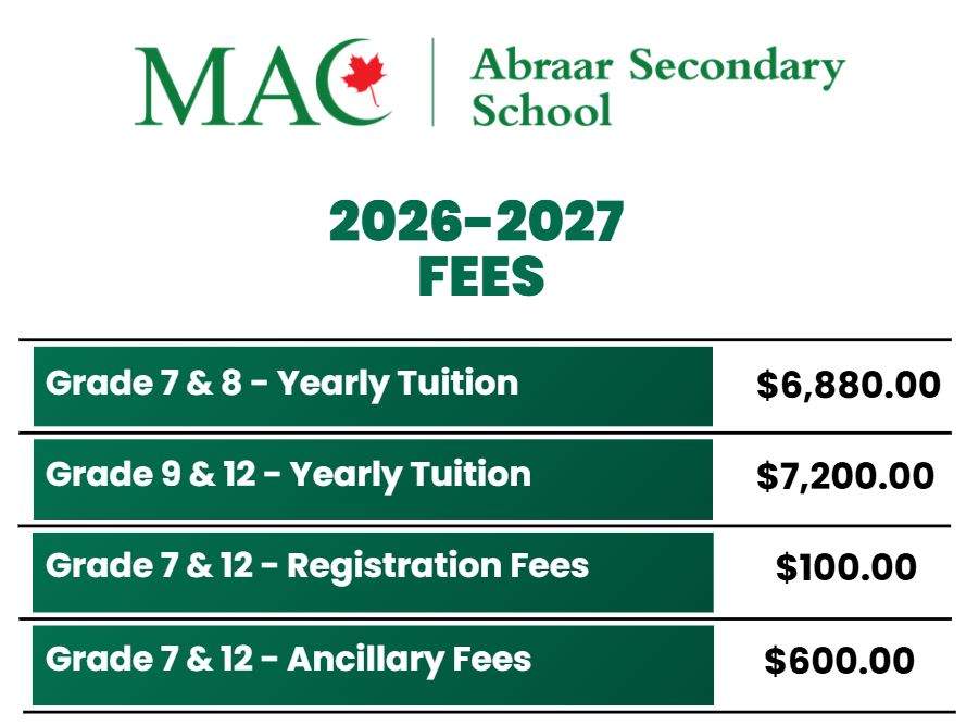 Parents Admissions Admissions 2026-2027 Registration Link (MACSIS) to register your child for Abraar Secondary School, please use this link. School Fees 2026-2027