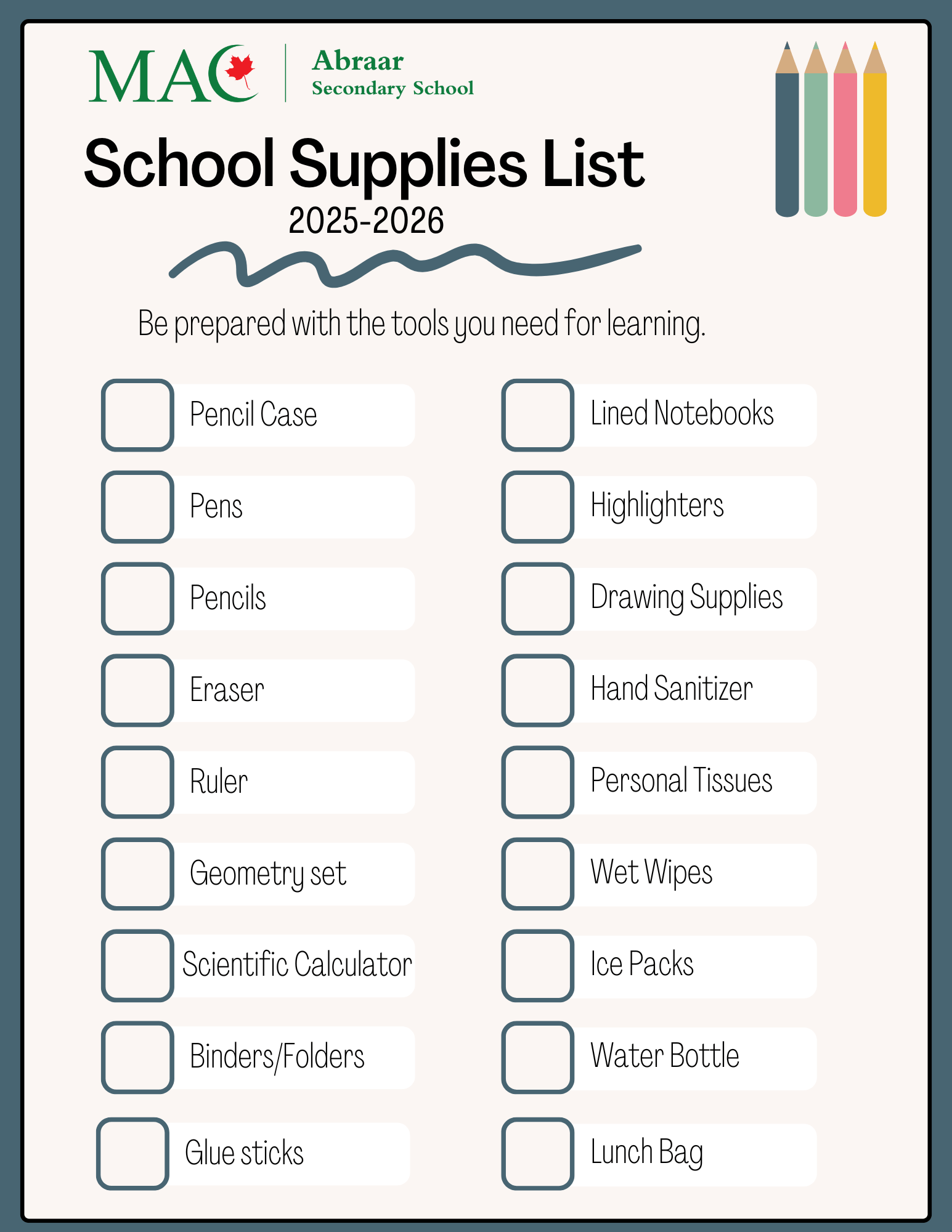Middle & High School Supply List 2025-2026