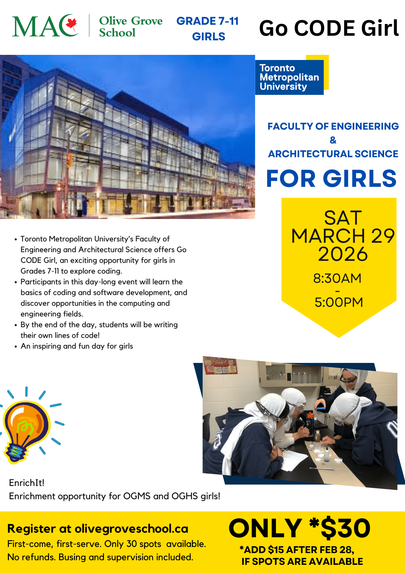 MAC Olive Grove High School (OGHS) is a private Islamic school registered with the Ontario Ministry of Education, offering a full Gr 9-12 program. We at OGHS strive to Inspire Believers to be Community Leaders, with a comprehensive program enriched with a strong academic as well as character education program.