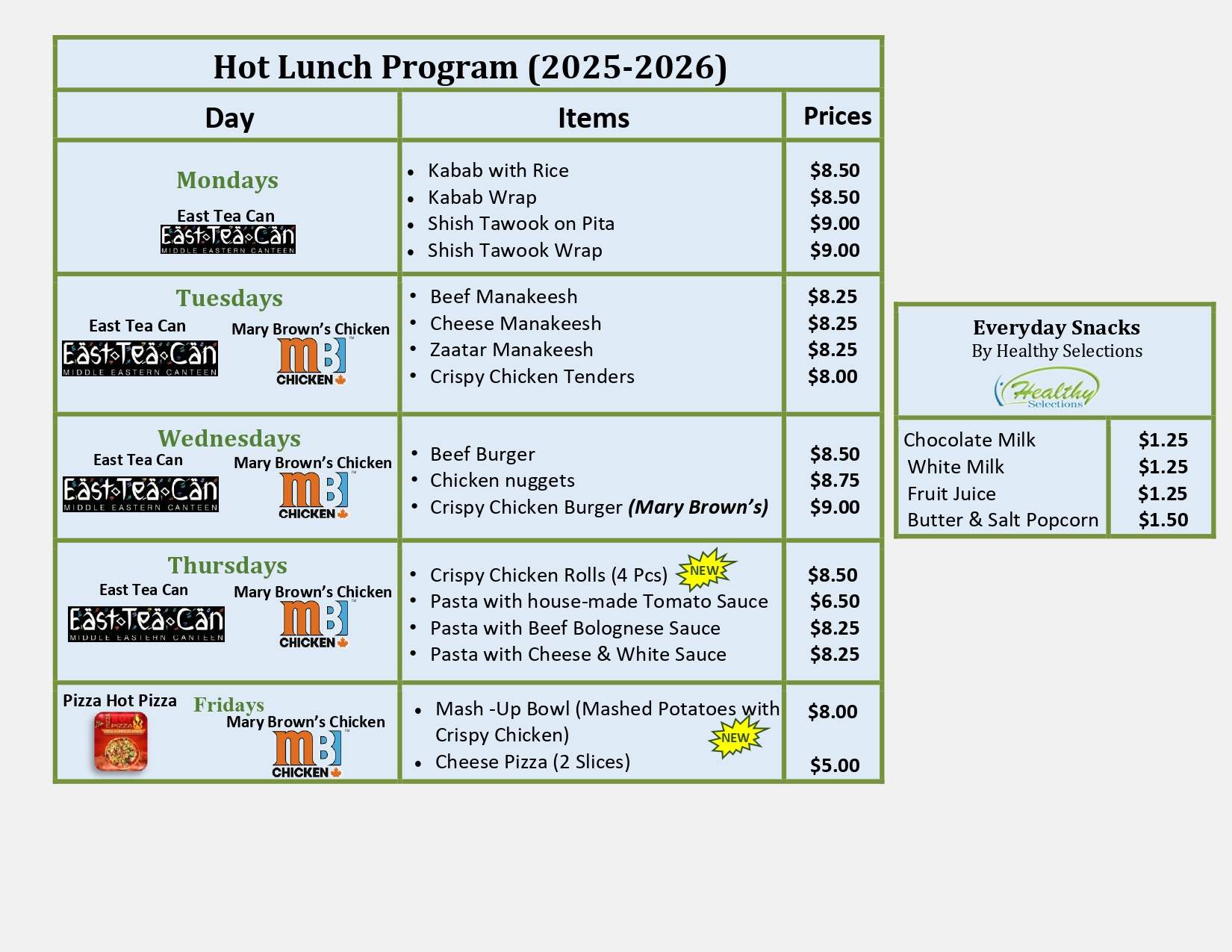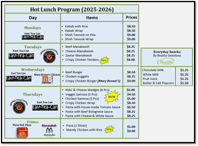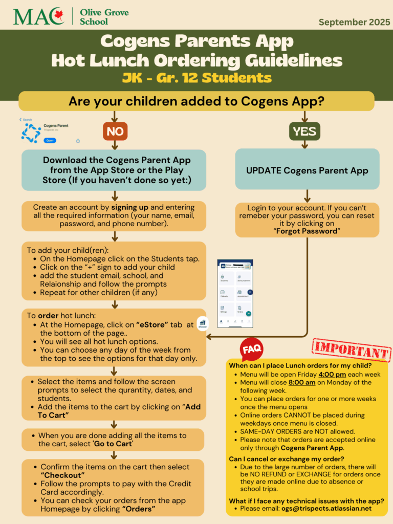 Welcome to MAC Olive Grove School Hot Lunch program! Students at MAC-Olive Grove School will enjoy a hot meal at their lunch time! The hot lunch program is open for JK – Gr. 12 students. Parents can place hot lunch orders online for their children weekly, monthly or for specific days of the week/month through the Cogens Parent App.